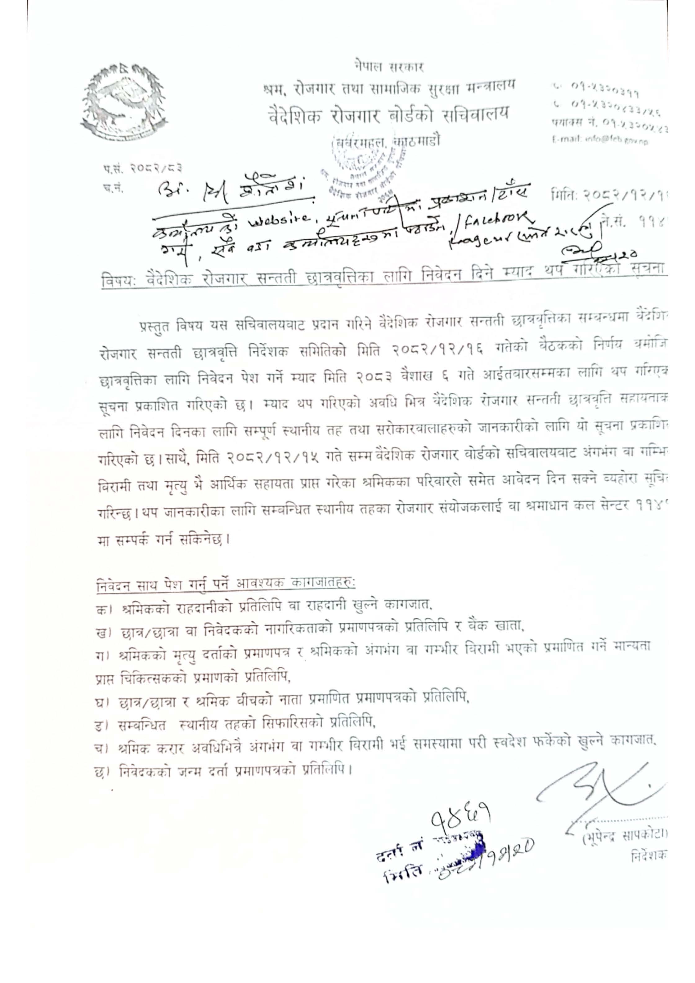 बैदेशिक रोजगार बोर्डको सचिवालयको बैदेशिक रोजगार सन्तती छात्रवृत्तिका लागि निवेदन दिने म्याद थप गरिएको सूचना।