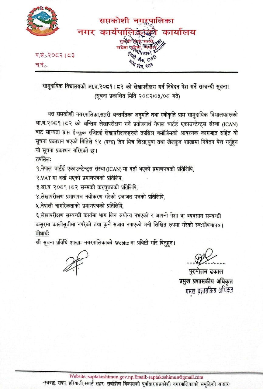 सामुदायिक विद्यालयको लेखा परीक्षण गर्न निवेदन पेश गर्ने सम्बन्धी सूचना।